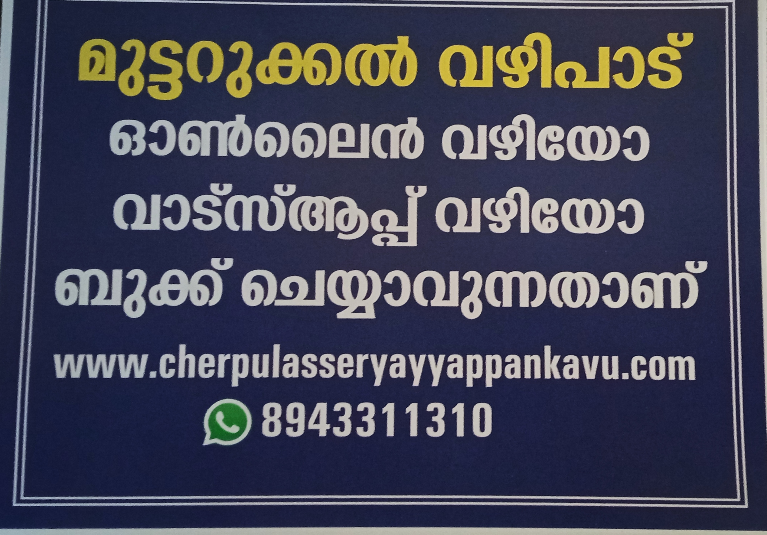 കലിയുഗവരദനായ ശ്രീധർമ്മശാസ്താവ് പത്നി പ്രഭയോടും മകൻ സത്യകനോടുമൊപ്പം ഗൃഹസ്ഥാശ്രമിയായി വാണരുളുന്ന പുണ്യക്ഷേത്ര സങ്കേതമാണ് മലബാറിലെ ശബരിമല എന്നറിയപ്പെടുന്ന ശ്രീ ചെർപ്പുളശ്ശേരി അയ്യപ്പൻകാവ് . 108 ശാസ്‌താക്ഷേത്രങ്ങളിൽ അതി പ്രധാനമായ ഈ ക്ഷേത്രത്തിനു 1200 വർഷത്തോളം പഴക്കമുണ്ട്. ഒരു കാലത്ത് പത്തിലധികം നമ്പൂതിരി ഇല്ലങ്ങൾ ഉണ്ടായിരുന്ന ഈ പ്രദേശത്തെ ഒരു നമ്പൂതിരി ഇഷ്ടസന്താന ലബ്ധിക്ക് വേണ്ടി പെരുവനം ഗ്രാമത്തിലെ പ്രസിദ്ധമായ തിരുവുള്ളക്കാവ് ശാസ്താവിനെ ഭജനമിരുന്നു. വർഷങ്ങളോളം ഭജനമിരുന്ന് അവശനായ അദ്ദേഹം സ്വന്തം ഇല്ലത്തേക്ക് തിരിച്ചുപോന്നു. അദ്ദേഹം കാലത്തു ഉണർന്ന് നോക്കിയപ്പോൾ നടുമുറ്റത്ത് ഉയർന്നു നിൽക്കുന്ന ചുരിക (അയ്യപ്പന്റെ ആയുധം ) കണ്ടു ആനന്ദ സ്തബ്ധനായി നിന്നുപോയി. സ്പർശിച്ചമാത്രയിൽ ചുരിക ഭൂമിയിലേക്ക് താണുപോയെങ്കിലും സ്വയംഭൂവായി അയ്യപ്പന്റെ ശില ഉയർന്നുവരികയും ചെയ്തു. പരമഭക്തനായിരുന്ന നമ്പൂതിരി ഇല്ലത്ത് അവശേഷിച്ചിരുന്ന പത്മമമിടാനുള്ള അരിയും ശർക്കരയും ഉപയോഗിച്ചു അടയുണ്ടാക്കി ദേവനു നിവേദിക്കാൻ ഒട്ടും അമാന്തിച്ചില്ല. ആദ്യമായി നിവേദിച്ച ഈ അട ഇന്നും ദേവനു പ്രിയപ്പെട്ടതായി നിലനിൽക്കുന്നു.